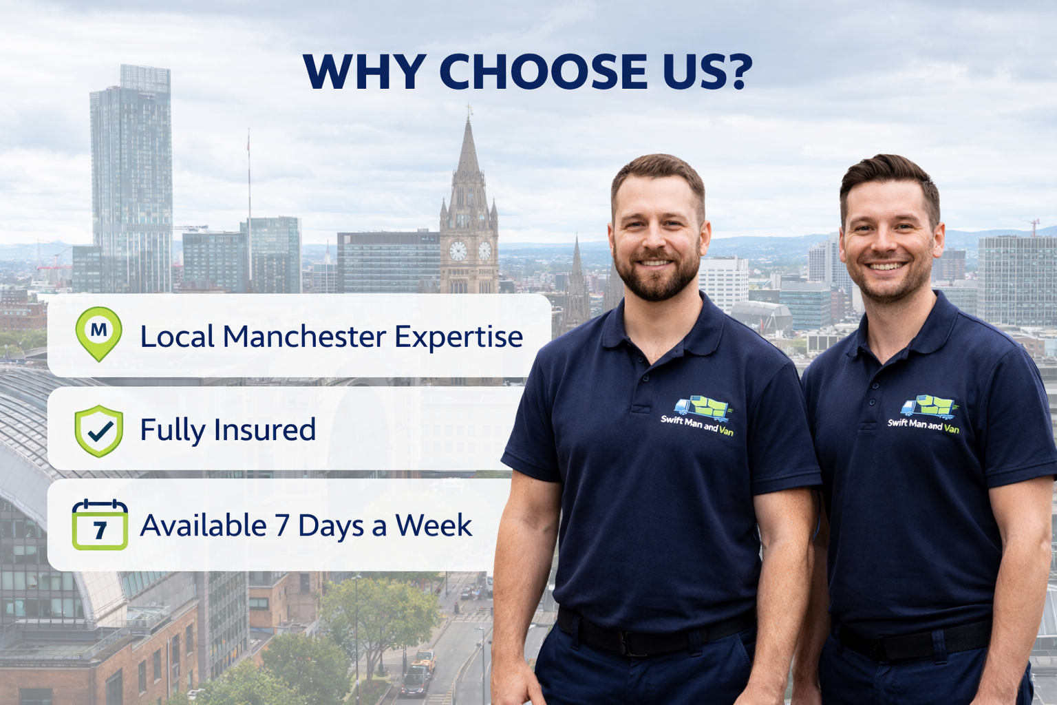 If you need a reliable man and van or removal service in Manchester, Swift Man and Van is ready to help. Whether you are moving a few items, relocating your home, arranging a student move or planning an office relocation, we offer practical moving support with clear communication and dependable service.